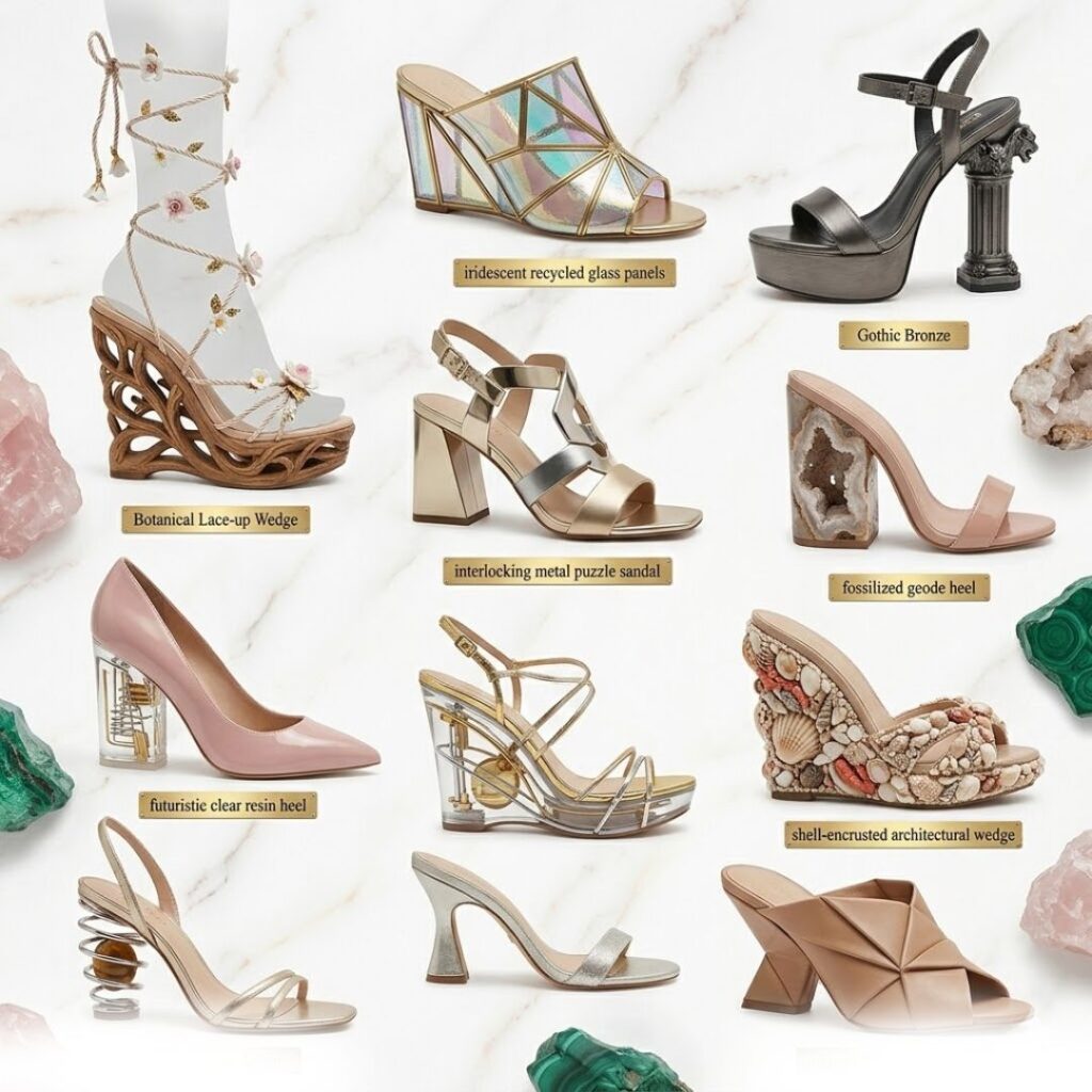 Cone heels have seen a significant revival in 2026, appearing in bold colours, translucent resins, and hand-painted finishes. Beyond the cone, the broader world of sculptural heels includes geometric shapes, wrapped heels, flared heels, and even conceptual designs that blur the line between footwear and wearable art.